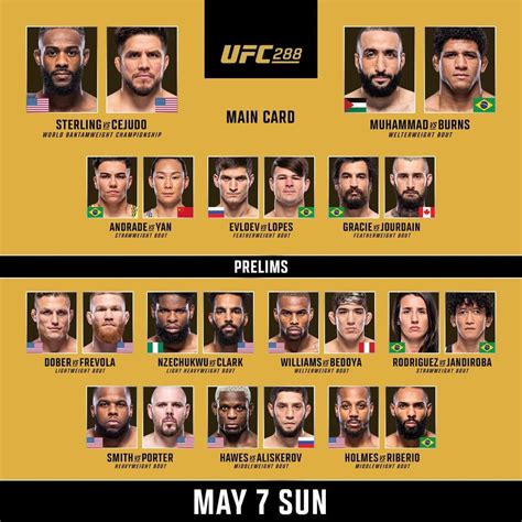 u f c 288 6 พ.ค. 2566 — UFC 288: STERLING VS CEJUDO takes place Saturday, May 6 from the Prudential Center with the main card at 10 pm ET/7 pm PT on ESPN+ PPV. The ...